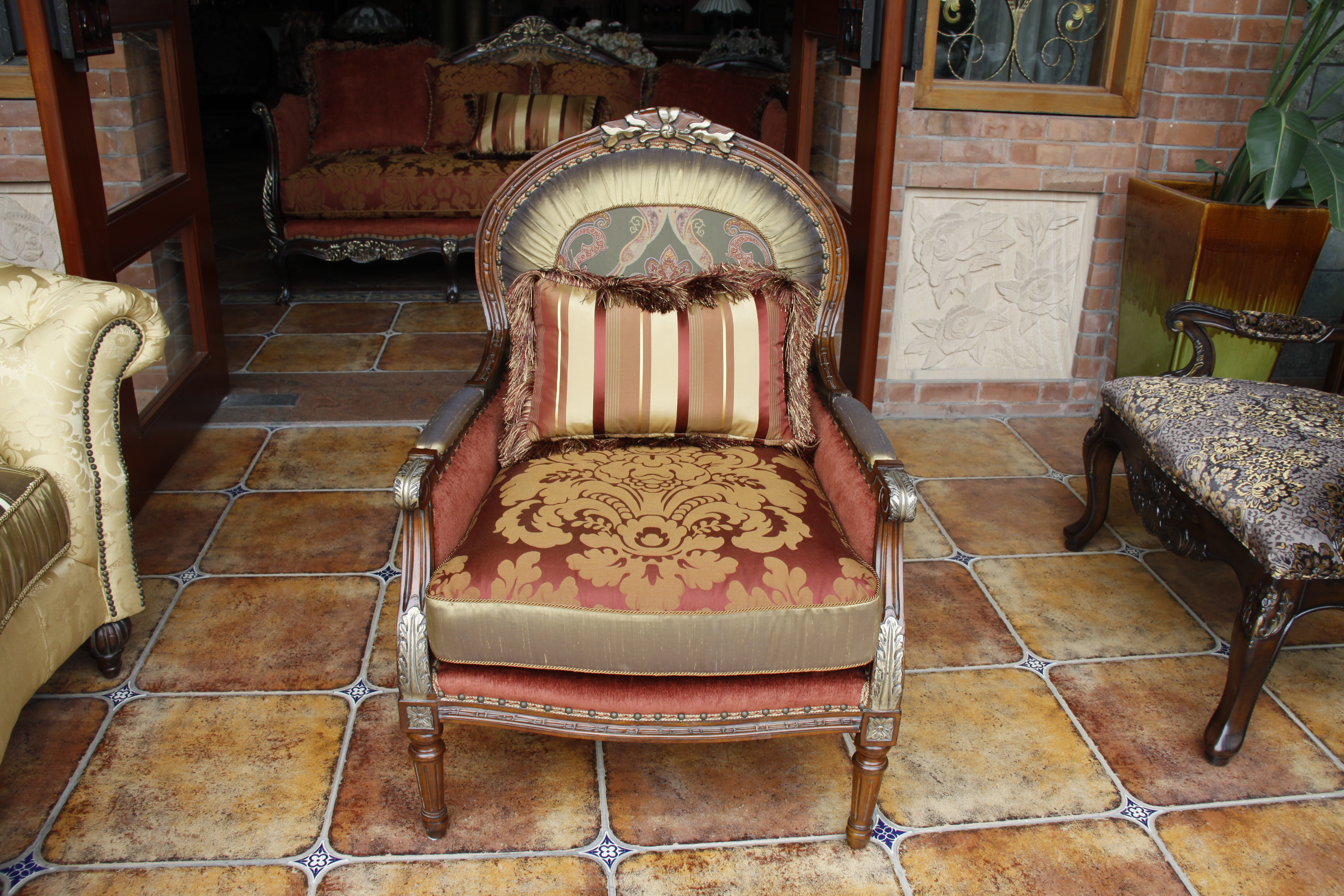 The elaborative, yet elegant silhouette features an exposed (often wooden) frame with a ball-and-claw foot design defined by an ‘S’design: the upper portion of the leg curves outward, while the lower portion curves inward. A curved back falls gently into sloping arms for a graceful design with continuous line