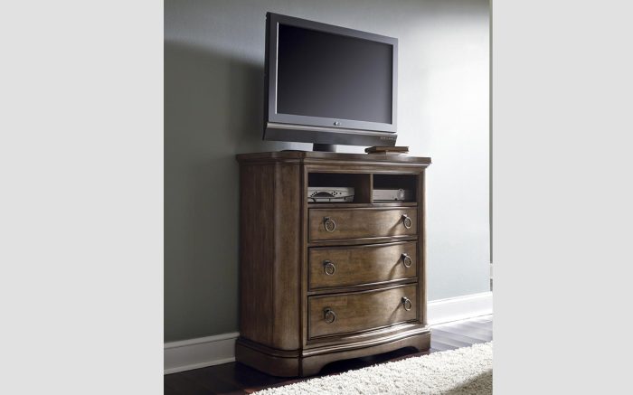 Create the perfect bedroom retreat with Aurora. Button tufted linen upholstered headboard with a graceful arched crown features nail head trim and shaped headboard, creating a classic, romantic setting. Case pieces feature shaped fronts with rounded pilasters.