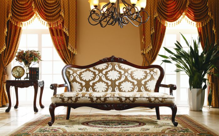 Luxurious and bright modern living room design with classic furniture, crystal chandelier and large wall art